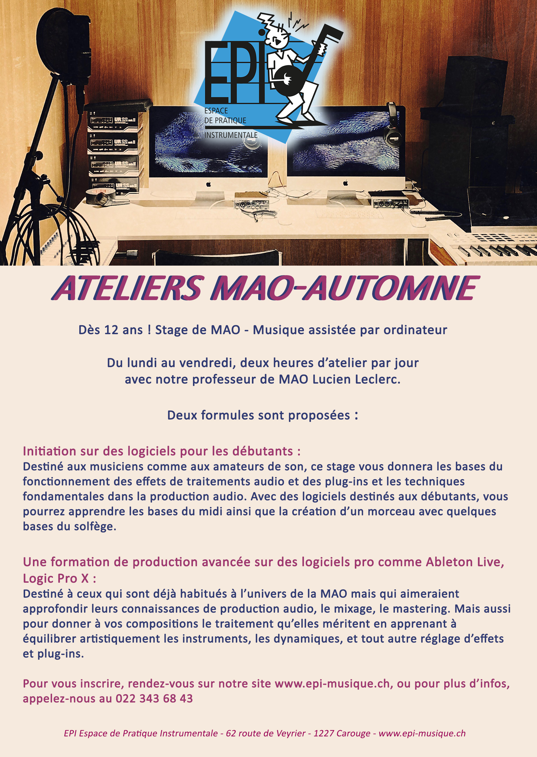 Enseignement 19 Oct Ateliers MAO-Automne Pat Goldblat 0 Commentaire Appelez-nous au 022 343 68 43 pour vous inscrire ! Lien de partage:
